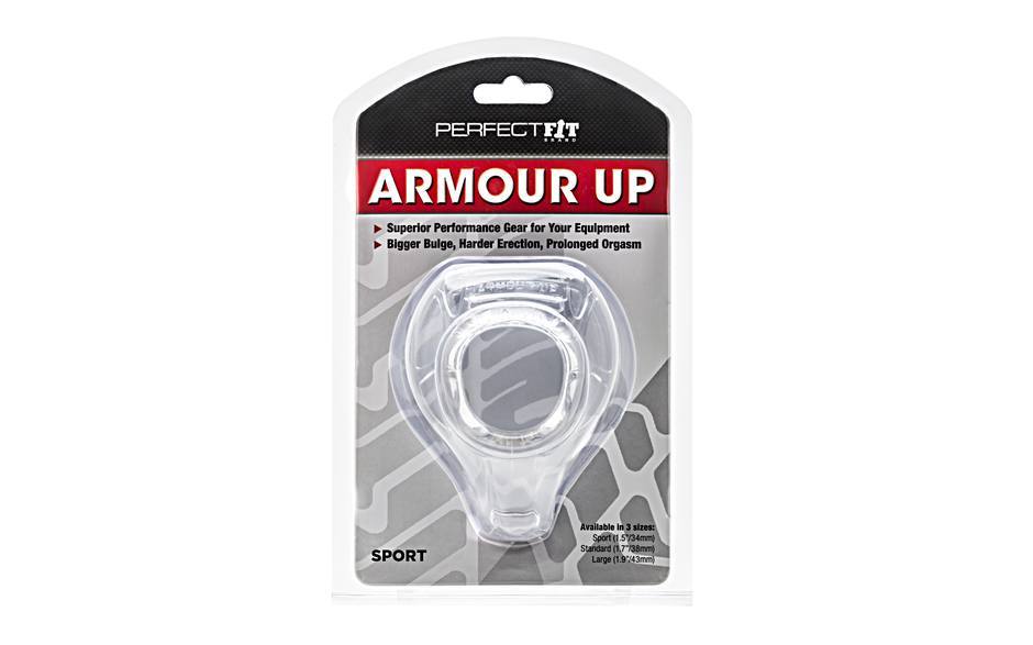 Armour Up is a slimmer and thinner version of the best-selling Cock Armour for bigger bulges, enhanced erections, and more intense orgasms! It is designed with a revolutionary anatomical shape that hugs your torso and pushes your gear out entirely from your body to enhance your penis and scrotum. Armour Up is made of PFBlend which is a proprietary blend of Silicone and TPR developed to provide superior stretch, comfort and durability. Armour Up comes in three sizes Sport (1.5"/38mm), Standard (1.7"/43mm), and Large (1.9"/48mm). It is available in two colors black, and clear and is safe with most lubes. Wash thoroughly with mild soap and water.Perfect Fit Brand Products are sold, and intended for use strictly as adult novelty toys for entertainment. They are not intended for medical use and have not been clinically tested. No medical claims are warranted or implied by the use of these products.