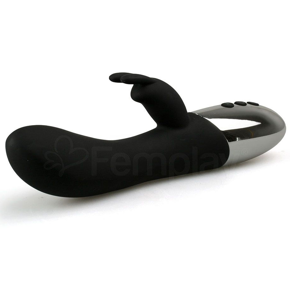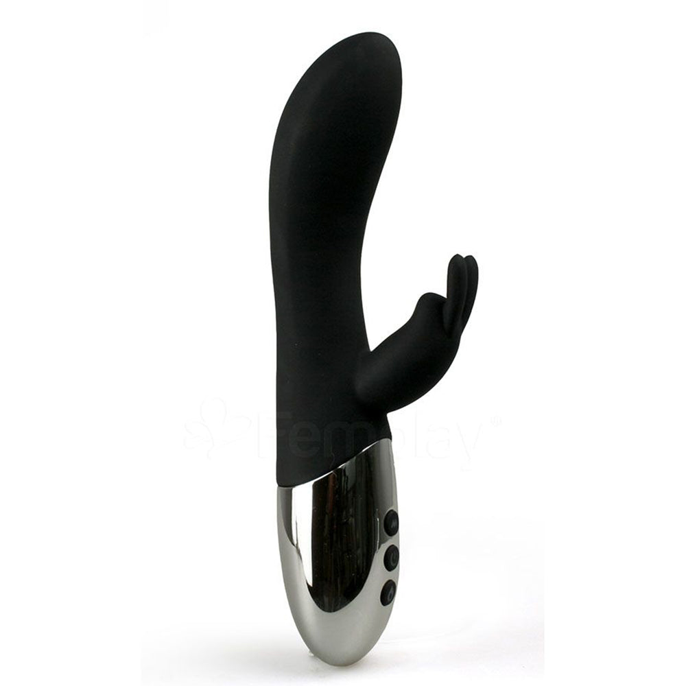 This dual-stimulating rabbit vibe features a flexible bunny ear clitoral teaser and a satisfying internal shaft that's curved to hit your G-spot perfectly. Made of silky, seductive silicone with a touch of silver luxury, this waterproof toy features 10 vibration functions with simple push-button controls to let you find your perfect setting. It also has a heating function that adds that extra level of delicious pleasure to your play time.