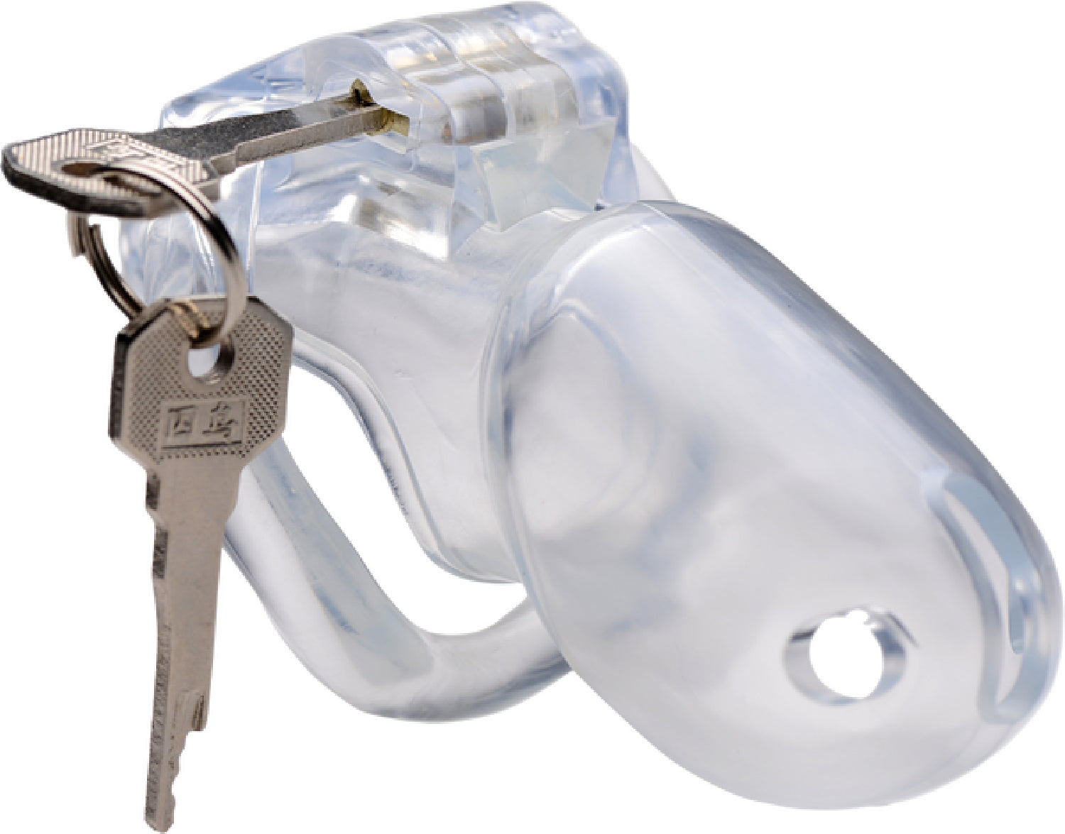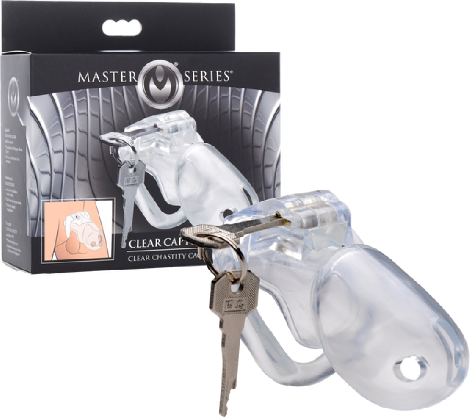 Confine your sub in this clear chastity prison! The Clear Captor locks your partners sexuality in clear view, preventing them from pleasuring themselves until you set them free. Made with forgiving materials for long term comfort, as well as a generous amount of ventilation holes and a pee through tip.