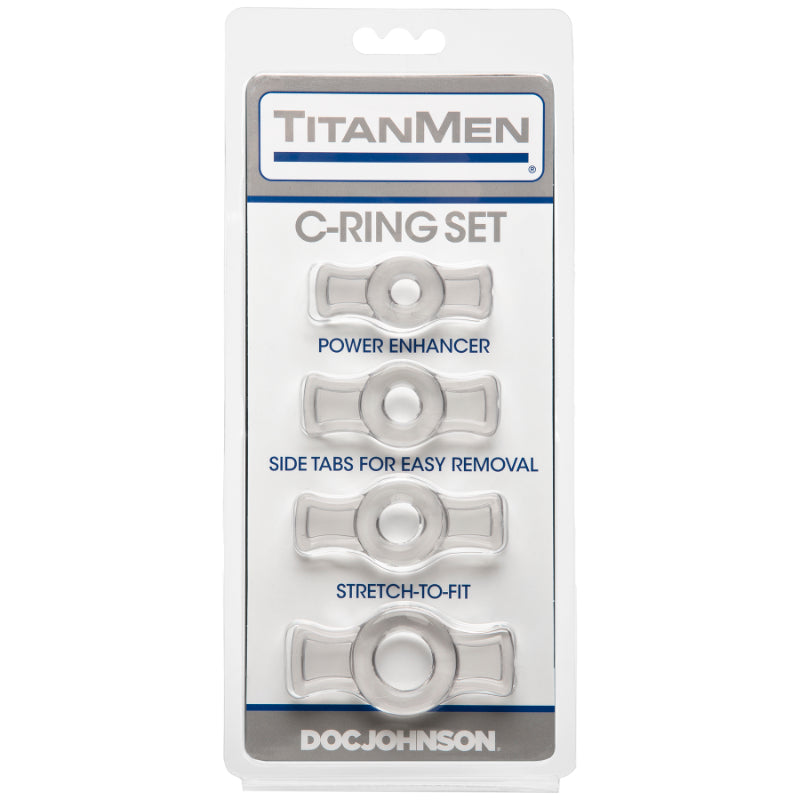 The largest flexible ring can accommodate up to a 3” diameter shaft. The rings are easy to place and remove, even with slippery hands, because each tab features a thick border, allowing the rings to be adjusted with ease. The TitanMen Tools Cock ring set is made of non phthalate TPR and is available in Black Blue and Clear.