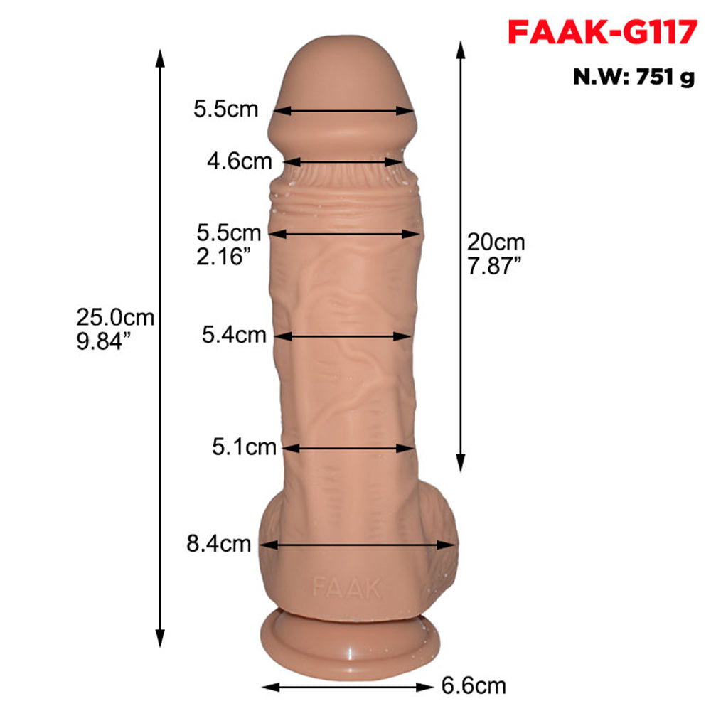 The FAAK G117 silicone dildo is made from high-quality dual-density Platinum Silicone. The lifelike silicone outer skin is smooth to the touch with realistic veins, while the hard silicone inner shaft is stiff and erect like an actual penis, making your pleasure experience as true to real life as possible!