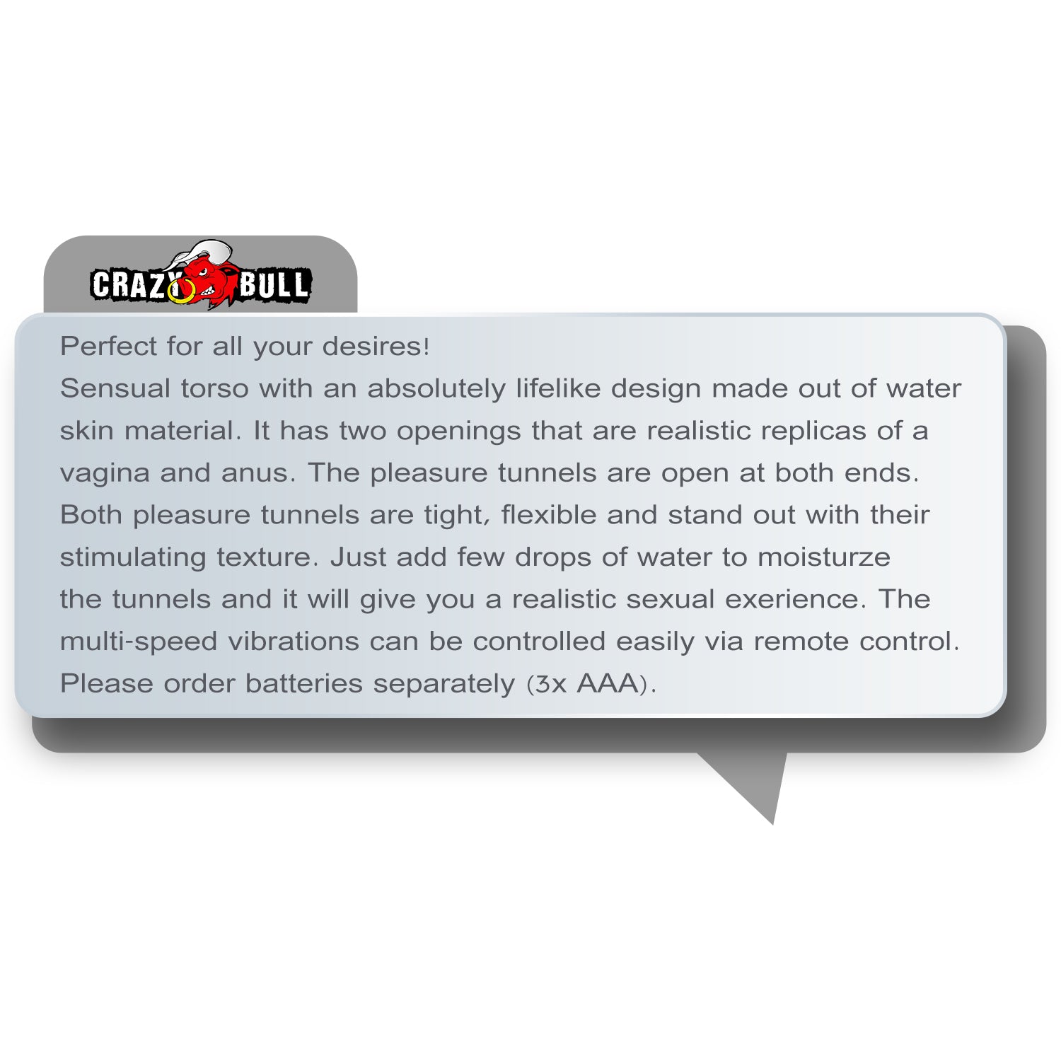 Sensual torso with an absolutely lifelike design made out of water skin material. It has two openings that are realistic replicas of a vagina and anus. The pleasure tunnels are open at both ends. Both pleasure tunnels are tight, flexible and stand out with their stimulating texture. Just add few drops of water to moisturize the tunnels and it will give you a realistic sexual experience. The multi-speed vibrations can be controlled easily via remote control. Please order batteries separately (3x AAA).