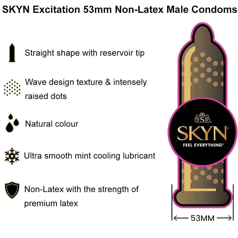 SKYN® Excitation condoms provide intense stimulation and maximum pleasure to her, thanks to intensely raised studs placed in a unique wave-like pattern and a long lasting cooling lubricant, while ensure great sensitivity to him, thanks to the properties of our SKYNFEEL® material.