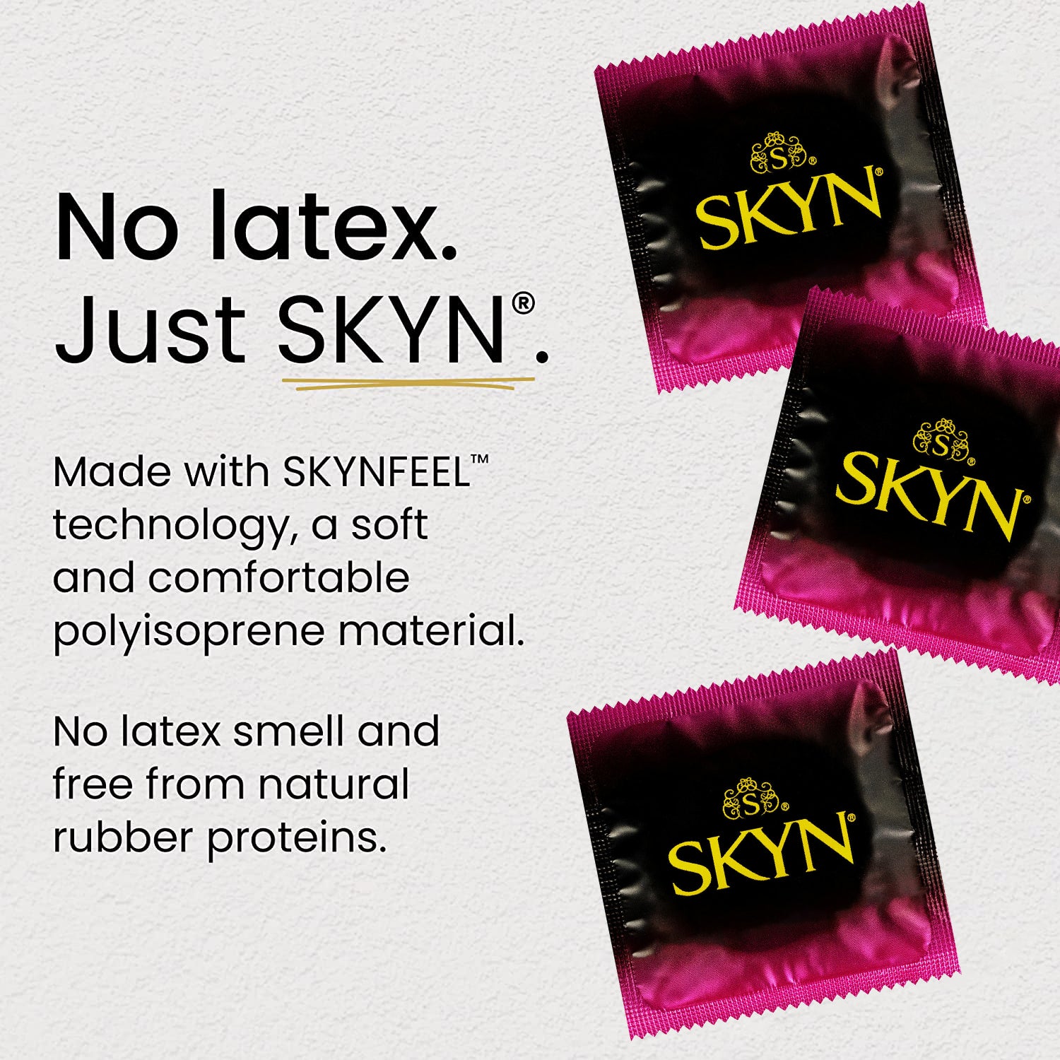 SKYNFEEL® material : All SKYN® condoms are made from SKYNFEEL® material, a revolutionary non-latex material that provides you and your partner a truly intimate sexual experience with a skin-to-skin sensation. It feels so soft and comfortable, you can feel everything.