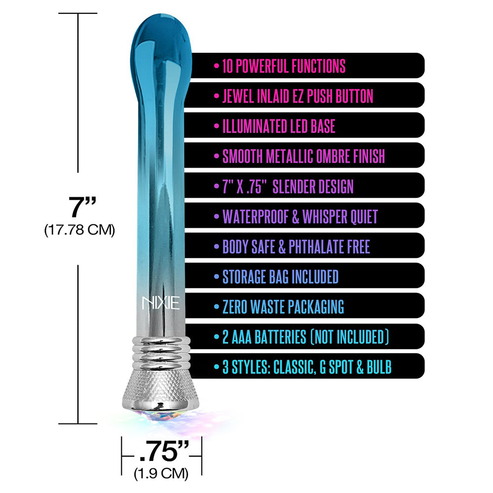 - The slender smooth Nixie Jewel Ombre Bulb Vibrator in blue ombre satin finish offers ten function multi-speed vibrations are controlled by a simple twist of the Jeweled Inlay at the base.
