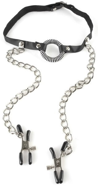 Get your lover to open wide and say "AHHH" with this naughty O-Ring Gag with Nipple Clamps. The gag consists of a small metal O-ring wrapped in leather, connected to two sturdy leather straps. Two chained nipple clamps keep your nipples perky, and the coated clamps easily adjust to fit your desired tension. The leather straps adjust to fit most sizes, pulling the ring tight and keeping the mouth open wide. You're in control over when and how often your lover speaks...what you do next is up to you!