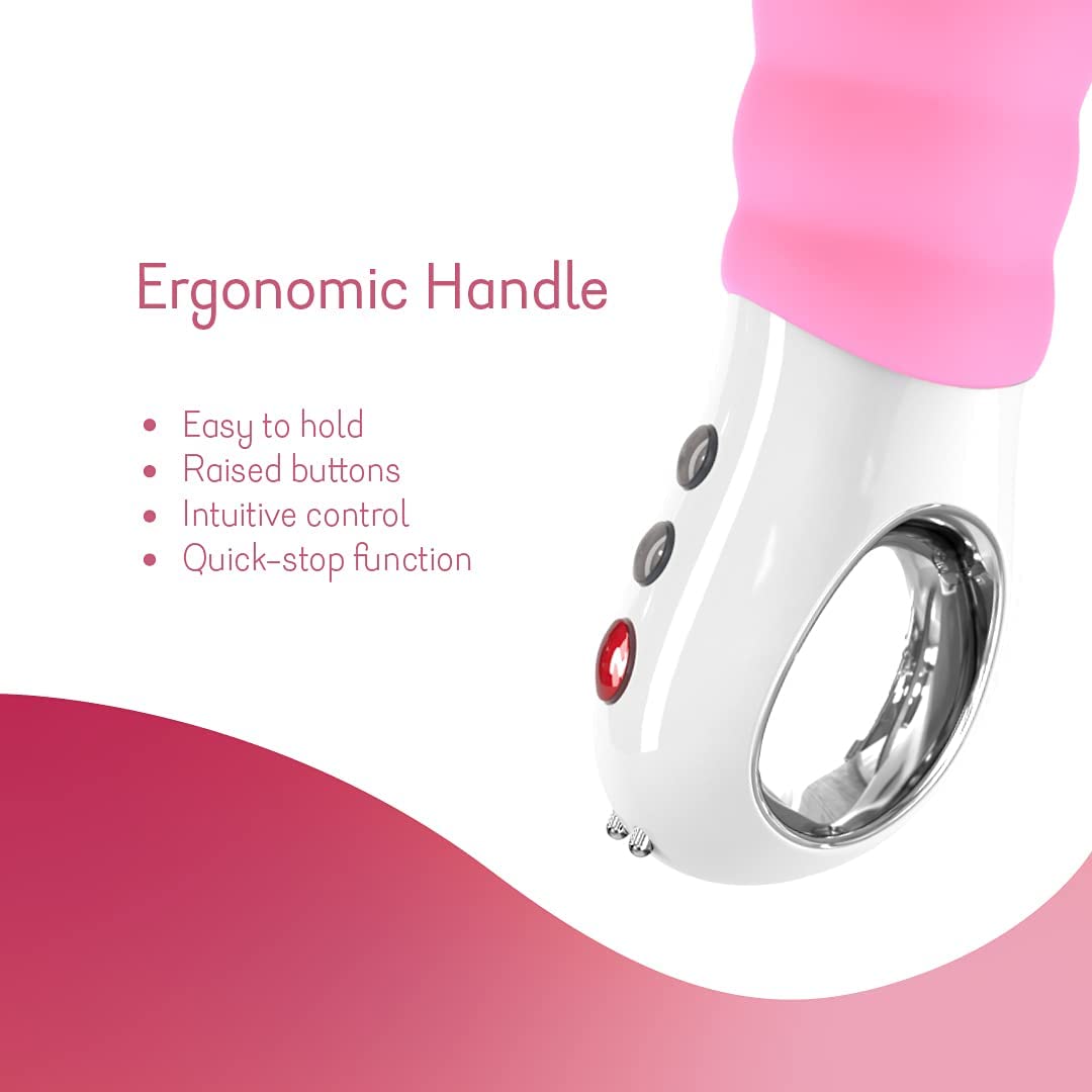 In fresh green, gentle candy rose or punchy neon orange, Patchy Paul, with a total of 12 vibration programs ensures with its decisiveness and flexibility for new impulses in your love life like never before - whether on a solo tour or with a partner. The ergonomic control unit with the LOOP, the little cut out in the handle, rests perfectly in the user's hand. The index finger is looped through the silver ring to hold it, then the toy rests in the palm and the three touch buttons of the PRESS FUN TO PLAY controls can be intuitively controlled with the thumb. Navigating is then easy and comfortable with the + and - buttons. The red FUN button starts and stops Patchy Paul's amorous discovery tour with just one click.