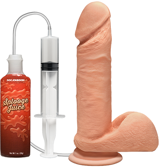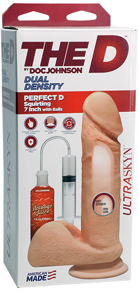 Everybody wants it! Molded from a real erect penis, the lifelike texture and proportions of the dual density ULTRASKYN Perfect D 7-Inch offer the most realistic look and sensation imaginable. The Perfect D is handcrafted to form the ideal balance between the soft, plush exterior and firm inner core that makes this collection so unique, and warms to body temperature with use. A strong suction cup base that affixes to most flat surfaces allows hands-free use, completing the realistic experience. The Squirting D comes with a 1 oz. bottle of Splooge Juice and squirts on command with handheld syringe.