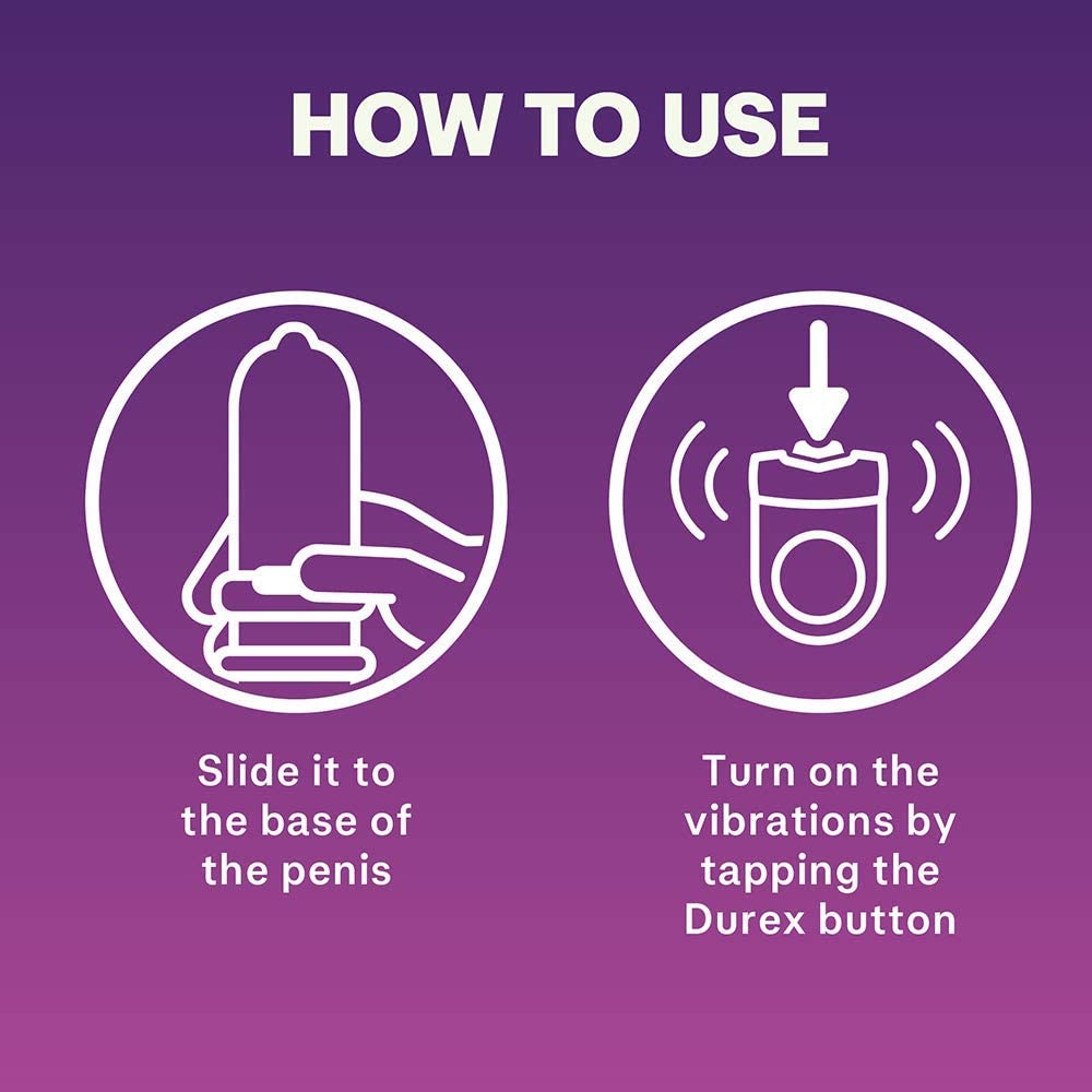 Durex Play™ Vibrations has been designed to bring up to 20 minutes of quivering pleasure to both of you. It's easy to switch on and off, easy to wear, and great to experiment with. Durex Play™ Vibrations can be used with or without a condom.