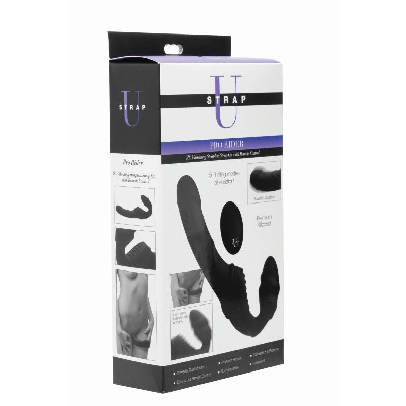 With a push of the button on the remote control, send vibration into the slender shaft and the textured bulb of this double-sided dildo. This rechargeable pleasure tool features dual motors to provide you with 3 speeds and 6 patterns of powerful internal thrumming for both partners. The single control button on the Pro Rider is easy-to-use and accessible during penetration, but a remote control makes it even more convenient and exciting! The silicone remote fits easily and securely in your hand while you immerse yourself in intimacy, granting access to all 9 functions. Both ends of this artfully designed double dong are shaped for the ultimate in ecstasy: the bulb is adorned with gentle waves while you grind your clit against bold grooves of the front pad. Meanwhile your partner will be treated to a narrow, comfortable shaft with a slight ridge. It is even waterproof so that you can take your play into the shower, bath, pool, and more! Explore greater intimacy with a vibrating double-ended strapon dildo. Made of silky silicone, the Slim Rider is non-porous and phthalate-free. Clean with warm water and mild soap or toy cleaner and avoid use with silicone lubricants.