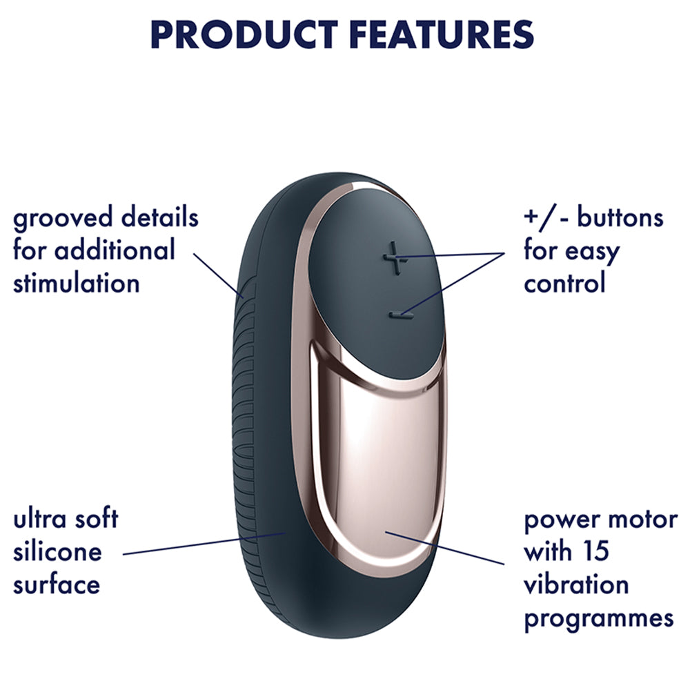 The Satisfyer Dark Desire is a handy lay-on vibrator that will give you breathtaking waves of pleasure with its powerful vibrations. The wide design stimulates your clitoris over a large area, and its grooved surface gives your skin a tingly feeling. The rounded, voluminous tip skillfully stimulates your little pearl - but doesn’t forget the surrounding nerves as well. Despite its compact design, the Satisfyer Dark Desire hides a powerful motor that will spoil you with 15 exciting vibration levels. The vibration levels are composed of 10 rhythms and 5 speeds, so this pleasure-bringer can adapt perfectly to any mood. The device is whisper quiet, and can be controlled intuitively with the soft silicone buttons. If your little playmate is exhausted after a session, you can recharge it with the included magnetic USB charging cable.