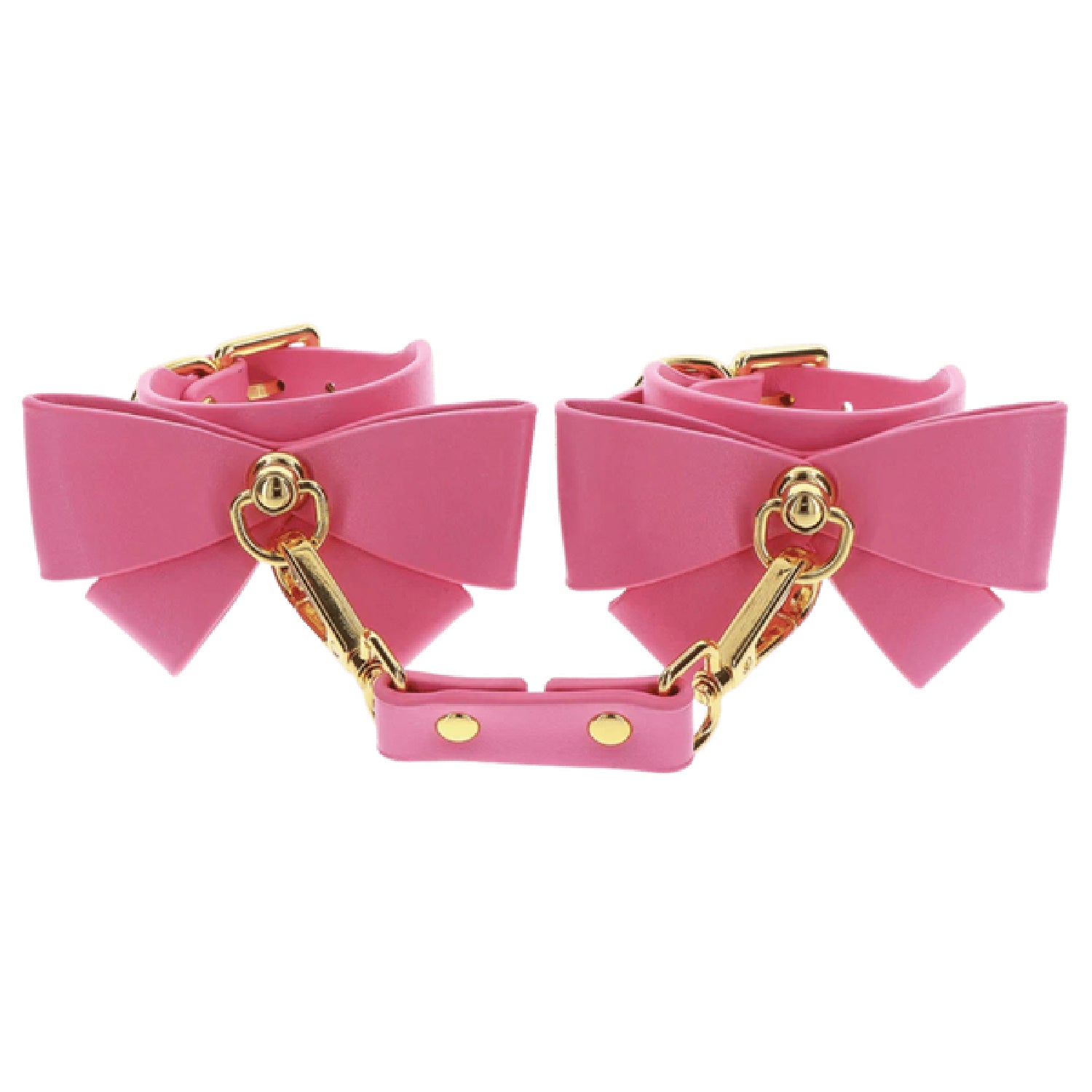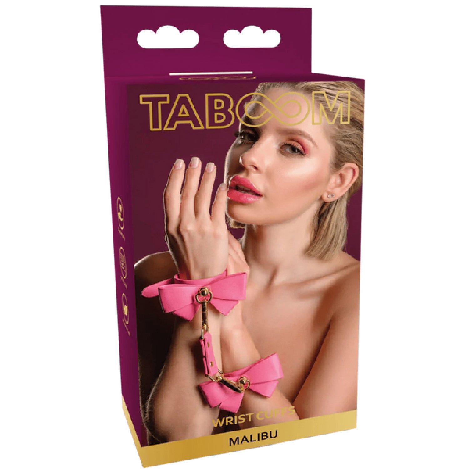 Add a touch of cuteness and sexiness to your bondage collection with these Taboom Malibu Wrist Cuffs. Embrace your playful side with these pink vegan PU leather cuffs adorned with a charming bow and tantalizing gold-plated metal details. Blend style and pleasure, explore the world of bondage, or wear them as a fashion statement. The adjustable fit ensures comfort and security during intimate moments. The solid clips and rings allow for various play, offering endless possibilities for restraint and pleasure. Indulge in passionate adventures and express your unique style with these exquisite wrist cuffs.